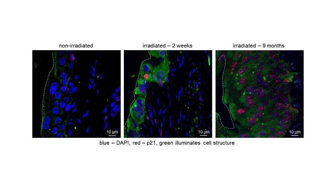 Cellular senescence plays an important role in tissue repair after short-term damage, however, insufficient elimination and/or excessive accumulation of senescent cells at the following stages is associated with increased tissue damage and fibrosis. P21 is a cyclin-dependent kinase inhibitor that maintains the viability of DNA damage-induced senescent cells and is considered to be a reliable senescence marker. Its’ increase in bladder wall at the later stages of radiation cystitis indicates a large number of urothelial cells, which may promote recurring inflammation and further tissue fibrosis.