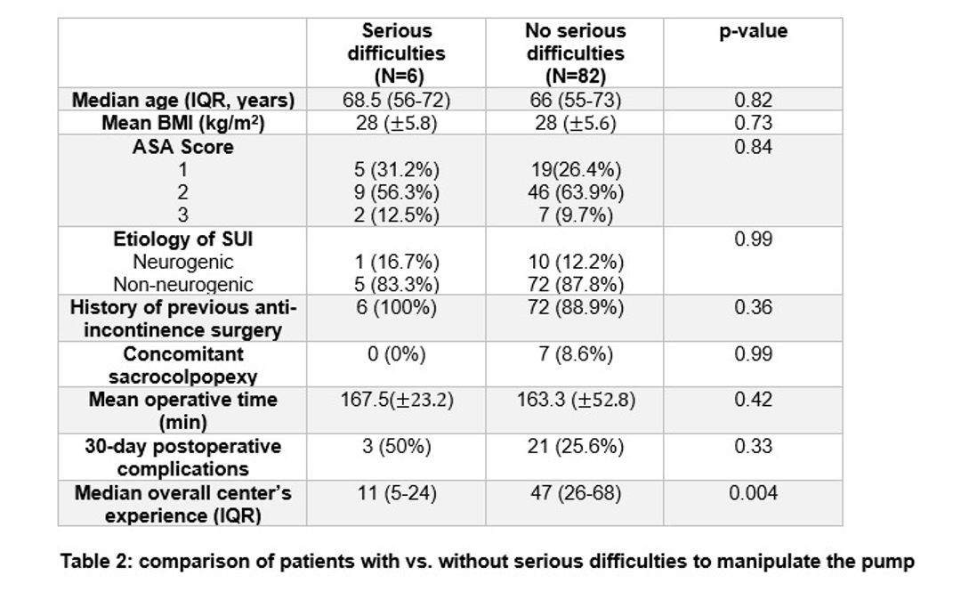 Artificial urinary sphincter (AUS) is a therapeutic option in female patients with stress urinary incontinence (SUI) due to intrinsic sphincter deficiency (ISD). Female AUS is gaining popularity in several countries with the rise of robotic implantation which improves greatly the perioperative outcomes. The AMS-800 AUS is a silicone device made of three pieces: a cuff which is placed around the bladder neck, a pressure regulating balloon (PRB) which is placed in the Retzius space and a pump which is placed in the labia majora. The patient has to squeeze the pump to deflate the AUS cuff which result in opening of the bladder neck allowing the patient to void with low urethral resistance. While pump manipulation is rarely an issue in male AUS patients, this may be different in female patients due to anatomical or cultural reasons. The aim of the present study was to assess the prevalence of difficulties to manipulate the pump in female AUS patients as well as the risk factors and management of this challenging situation.