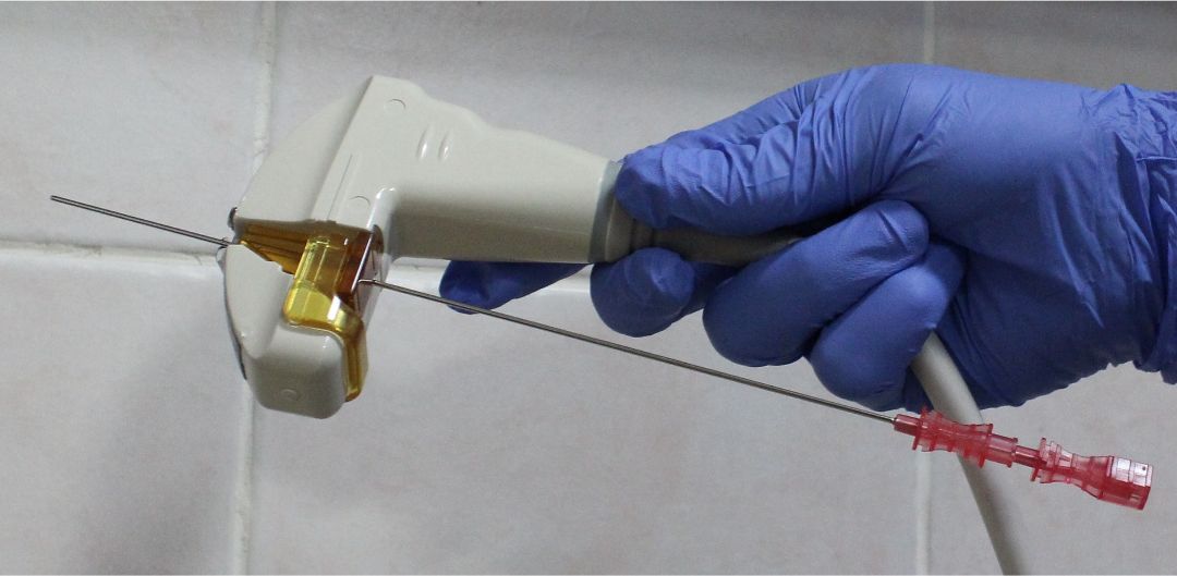 The needle entry for the PCNL procedure is usually guided by fluoroscopy. The standard method uses the Bull's eye technique or carnio-caudal technique. Using USG guidance for percutaneous access for PCNL is a well-established, safe, and effective method. (1) Some urologists use ultrasound guidance for the entry. Standard probes have an external needle guide, which may target 35 to 45’. This high-degree angle makes it difficult to align with the calyceal axis. Our novel method involved a hockey stick-shaped special convex probe with a needle guide at a 5’ and 25’ angle to make perfect and easy calyceal punctures.