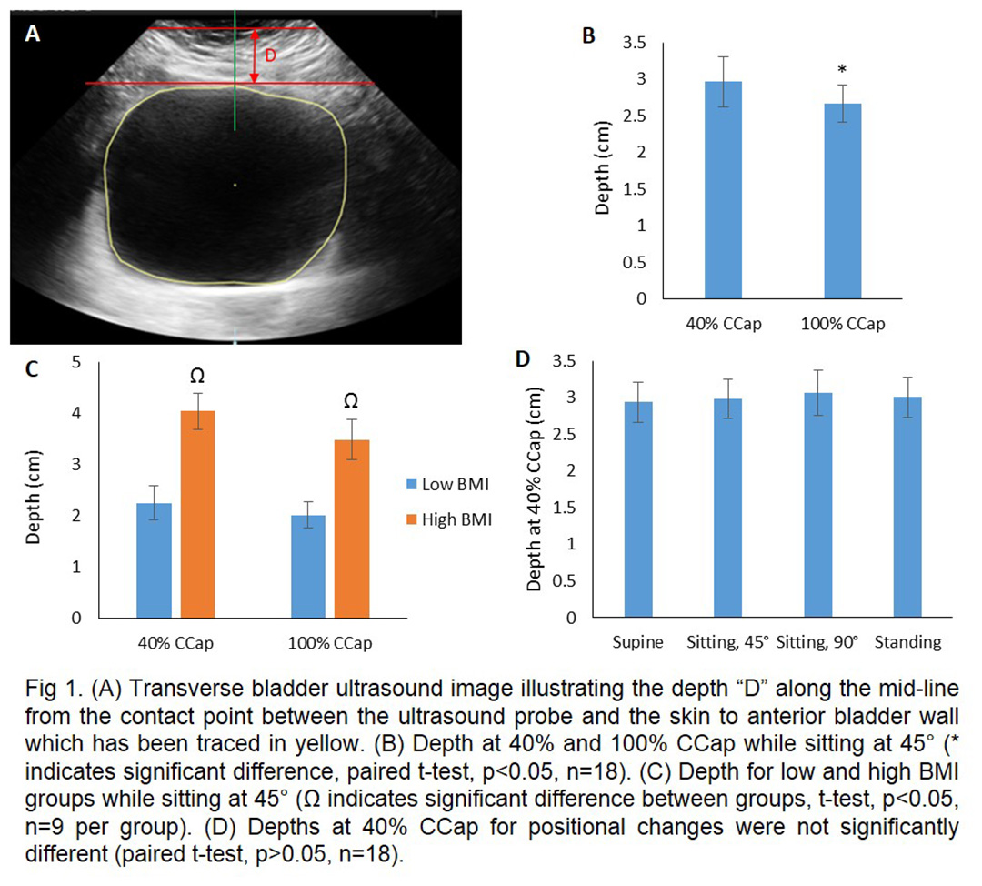 Transabdominal near infrared spectroscopy (NIRS) analysis of changes in concentration of oxygenated and deoxygenated hemoglobin during bladder voiding is an effective non-invasive screening tool for bladder outlet obstruction [1]. Bladder wall micromotion due to detrusor smooth muscle contractions during bladder filling are elevated in patients with overactive bladder [2]. We propose that NIRS may provide valuable information about bladder filling, including potential noninvasive, ambulatory, at-home estimation of bladder wall micromotion for overactive bladder assessment. But, unlike NIRS assessment of skeletal muscle activity during exercise or brain activity, the distance from the NIRS probe to the target tissue in bladder applications could vary significantly with body mass index (BMI), bladder volume, and patient body position. Using NIRS to analyze bladder function requires an optically appropriate distance between the skin at the probe location and the anterior bladder wall. The objective of the present study was to determine if variations in the distance between the skin and the anterior bladder wall as a function of BMI, bladder volume or body position preclude use of bladder filling phase NIRS diagnostics for overactive bladder.