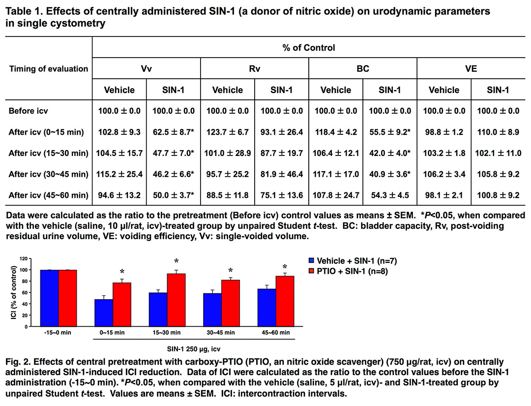 Previously, we reported that the sympatho-adrenomedullary (SA) system, a representative response to stressful conditions, is activated by centrally administered SIN-1 [1], a nitric oxide (NO) donor.  Peripheral NO has a local inhibitory effect on urination [2], while, in the