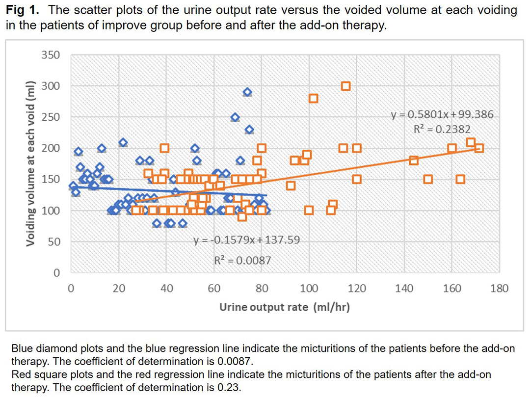 Men with LUTS who had residual OAB symptoms despite treatment with ABs or 5ARIs and received add-on therapy (MRAs or β3-AR agonist) for one year were included in this study. OAB was evaluated using the Overactive Bladder Symptom Score (OABSS). Residual OAB was defined as an OABSS total score greater than 3 and an urgency score greater than 2 before add-on therapy. Uroflowmetry, ultrasonography to measure the prostate volume, and 24-h frequency-volume charts (FVCs) were evaluated before and one year after add-on therapy. The 24-h frequency-volume chart (FVC) recorded the volumes voided, as well as the time of each micturition. The urine output rate was calculated by dividing the volume voided by the interval between 2 successive micturitions. According to the changes in OABSS between before and after add-on therapy, the patients were divided into two groups: the improvement group (OABSS decreased less than 2 after add-on therapy); and the no-improvement group (OABSS 2 or greater after add-on therapy). The association between the urine output rate and voided volume at each voiding was analyzed in each group. P-values <0.05 were considered significant.