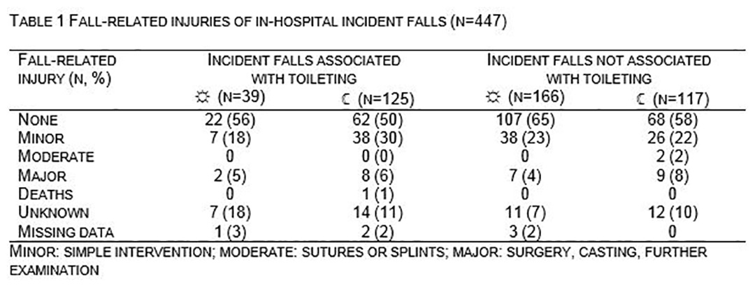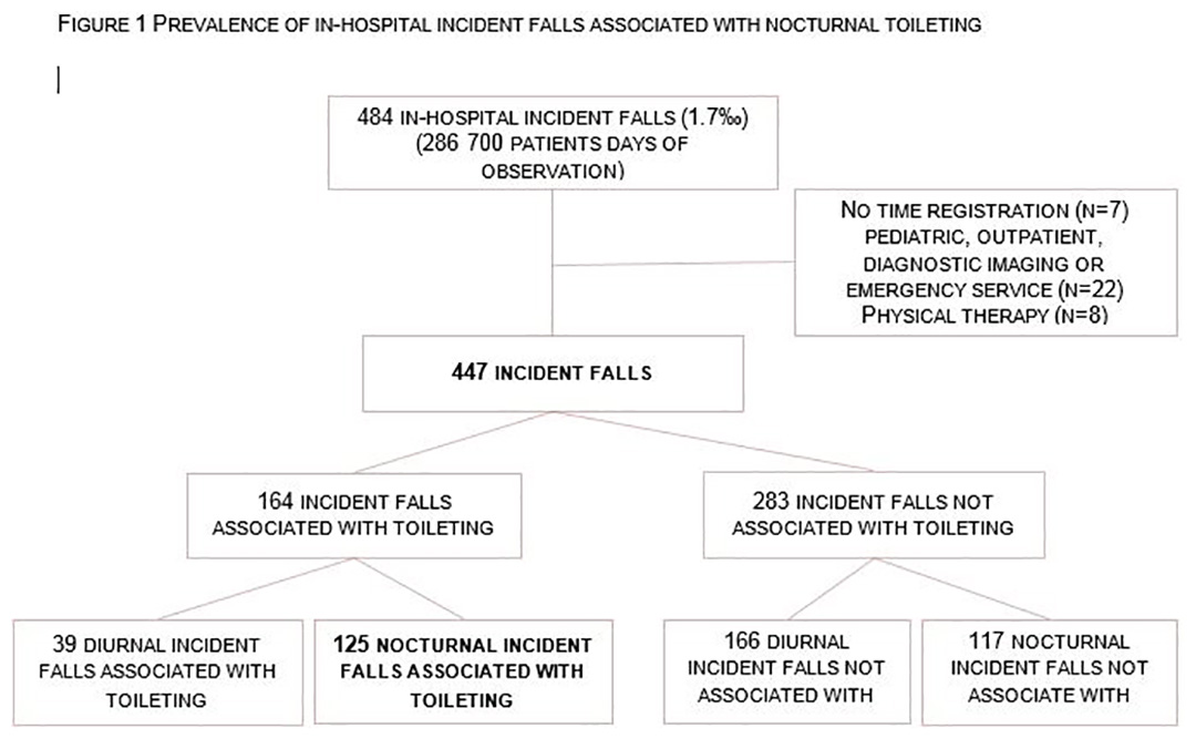 In a previous study, 50% of in-hospital falls was related to elimination, but the distribution between day and night was not described [3]. Taking into account the recommendations from the 6th international consultation on incontinence to perform research on the mechanisms, prevalence, incidence and remission rates of lower urinary tract symptoms in acutely hospitalised older people, the aim of this pilot study is to quantify the prevalence and fall-related injuries of in-hospital incident falls associated with nocturnal toileting.