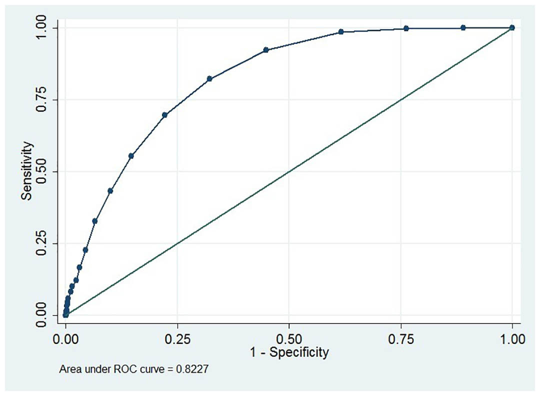 Receiver operating characteristic curve (ROC) analysis revealed daytime frequency episodes ≤ 24 in the three-day bladder diary was an optimal cut-off value to predict nocturnal polyuria (sensitivity = 56.2%, specificity = 51.3%; area = 0.54, 95% CI = 0.52 to 0.57, Fig 1). Nocturia episodes ≥ 5 in the three-day bladder diary was an optimal cut-off value to predict nocturnal polyuria (sensitivity = 82.3%, specificity = 67.7%; area = 0.82, 95% CI = 0.81 to 0.84). Thus, the predicted logit(p) for a given daytime frequency episodes (a) and nocturia episodes (b) can be denoted by logit(p) = -1.27 - 0.09 x a + 0.46 x b. The optimum cut-off values of logit(p) ≥ -1.49 to predict nocturnal polyuria were determined using ROC analysis (sensitivity = 88.2%, specificity = 69.0%; area = 0.85, 95% CI = 0.84 to 0.87, Fig 2).