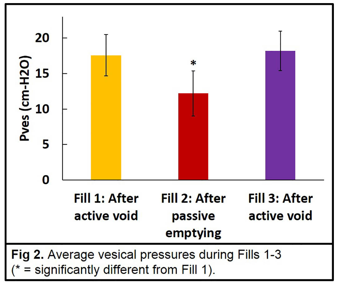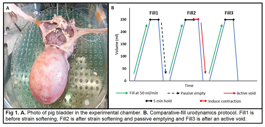 Pig bladders with the vascular tree and a portion of the aorta were harvested from a local abattoir immediately after slaughter and the vascular system was flushed with Krebs‐Henseleit buffer. After transport to the lab in cold buffer, the superior vesical arteries were cannulated and perfused with oxygenated physiologic-temperature Krebs‐Henseleit buffer at 4 mL/min. The urethra was catheterized to allow infusion, monitoring of intravesical pressure and bladder emptying (Fig 1 A). Bladders underwent a comparative-fill urodynamics protocol involving an initial fill plus three comparative fills (Fill 1-Fill 3) (Fig 1 B). All fills were to a volume of 250 mL, which was assumed to be 50% of a 500 mL bladder. These fills were followed by either passive emptying through syringe aspiration or by an active voiding contraction induced through vesical perfusion of high potassium buffer. Following the initial fill, an active void was induced to empty the bladder and reverse any strain softening. After the active void, filling pressure was recorded throughout Fill 1 (baseline, after active void), and then the bladder was passively emptied to prevent reversal of any strain softening due to Fill 1. After this passive emptying, filling pressure was recorded throughout Fill 2 (after strain softening). Next, the bladder was actively voided to reverse any strain softening, and then filling pressure was recorded throughout Fill 3 (after active void). To quantify dynamic elasticity, the average pressure throughout each fill was calculated and the change in average pressure between fills was divided by the change in percent capacity throughout filling [2].