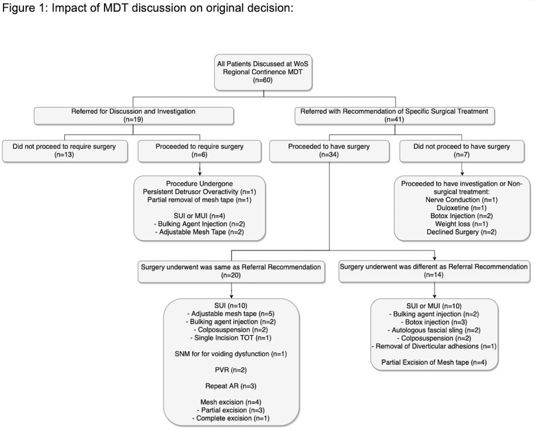 Throughout the existence of our Regional Continence MDT, between May 2010 and December 2015, 60 patients were discussed. Data on all 60 patients were collected and anonymised. Information gathered included time between referral, discussion, investigation and implementation of the management plan, patients’ presenting condition, reason for referral to MDT, pre and post-MDT management plans and treatment outcomes. The efficacy of the MDT was analysed by comparing the original recommendation by referring clinicians to the MDT recommendation and whether there was a clinical improvement.