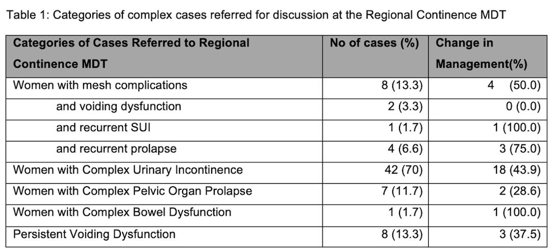 Our regional MDT was robust and has made a significant impact on the healthcare provided to women with complex urogynaecology and female urology conditions.  The MDT recommended a change in the original management plan by the referring professional in 25 cases (41.7%).  The conditions discussed by our group largely match the referral criteria recommended by NICE. The majority of women presented with either recurrent stress incontinence and/or mesh complications following continence surgery.  Among 28 patients who required surgery, the MDT recommended alternative surgical treatment in 12 patients (42.9%).  MDT meetings were also a gateway against more invasive testing including video urodynamics and UPPs.