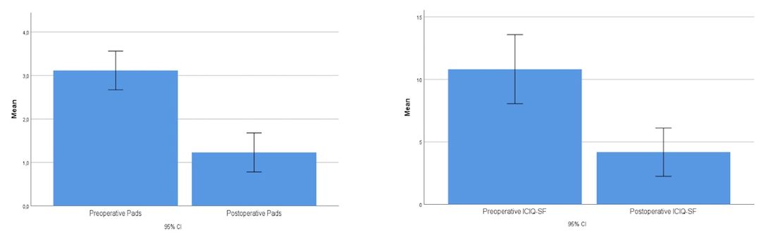 Statistically significant reductions in daily pads use and ICIQ-SF (t(21)=5.73; p<.001) were obtained (Figure 2). Patient-perceived quality of life significantly changed (t(26)=-7.18; p<.001) from a mean of 36.66 (SD=14.94) preoperatively to a mean of 76.11 (SD=21.14) after AdvanceTM XP implant on a 0-100 scale. Satisfaction with the procedure, on a 0-10 scale, was high (M=7.5; SD=2.3) and 78,8% would recommend the procedure to a friend or relative.
