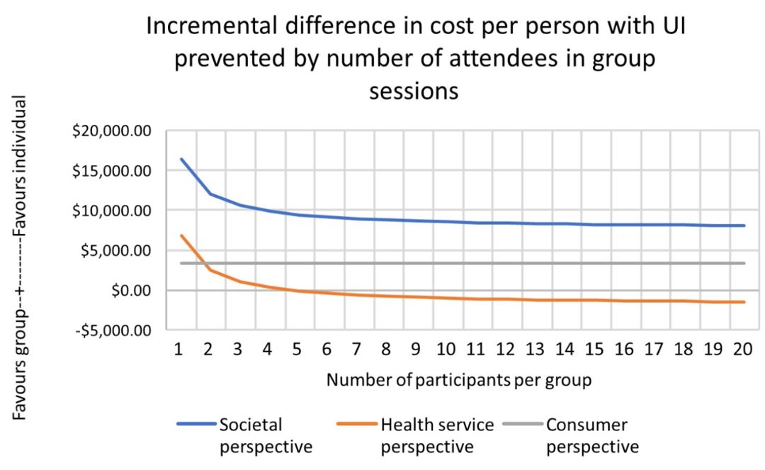 It is more efficient for health service providers to provide group-based prevention services during pregnancy to continent pregnant women than provide individual treatment services to incontinent women postnatally if at least 4 women can attend the group sessions.