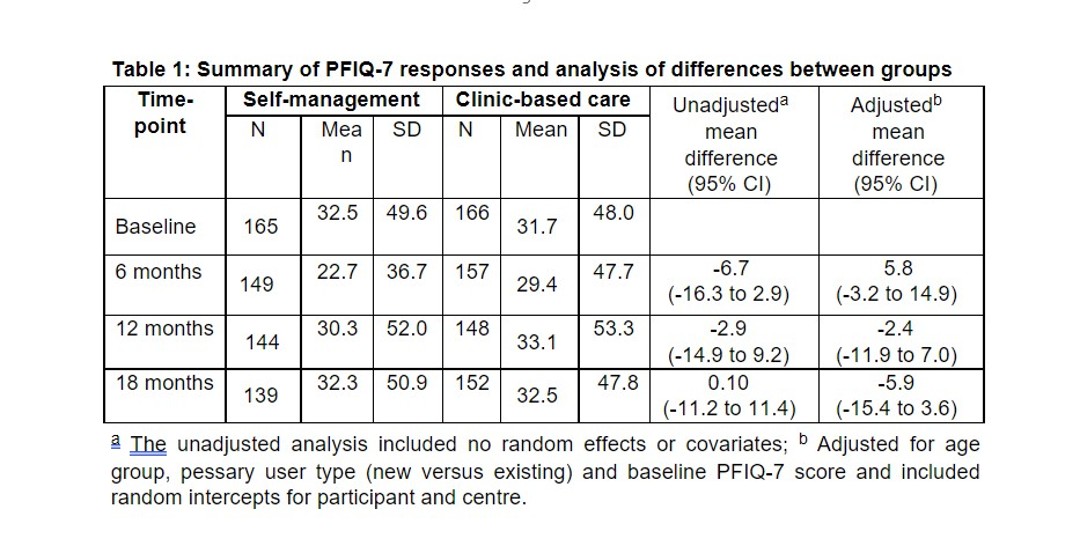 Participants were recruited between May 2018 and February 2020 at 21 centres across the UK where pessary care was delivered. The recruitment target was met, with 340 women with prolapse and receiving pessary care being randomised; 169 to self-management and 171 to clinic-based care. The PFIQ-7 scores at each time point are summarised in Table 1 along with the results of the primary analysis. The sensitivity analyses and subgroup analyses of the PFIQ-7 data all showed no significant difference between groups. Analysis adjusting for clinic-based care appointments cancelled due to COVID-19 also did not alter the findings.