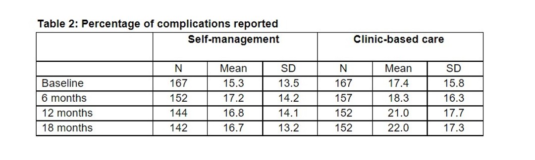 There were no reported unexpected serious adverse reactions. There were 30 serious adverse events (17 self-management, 13 clinic-based care), all of which were unrelated to the intervention received.