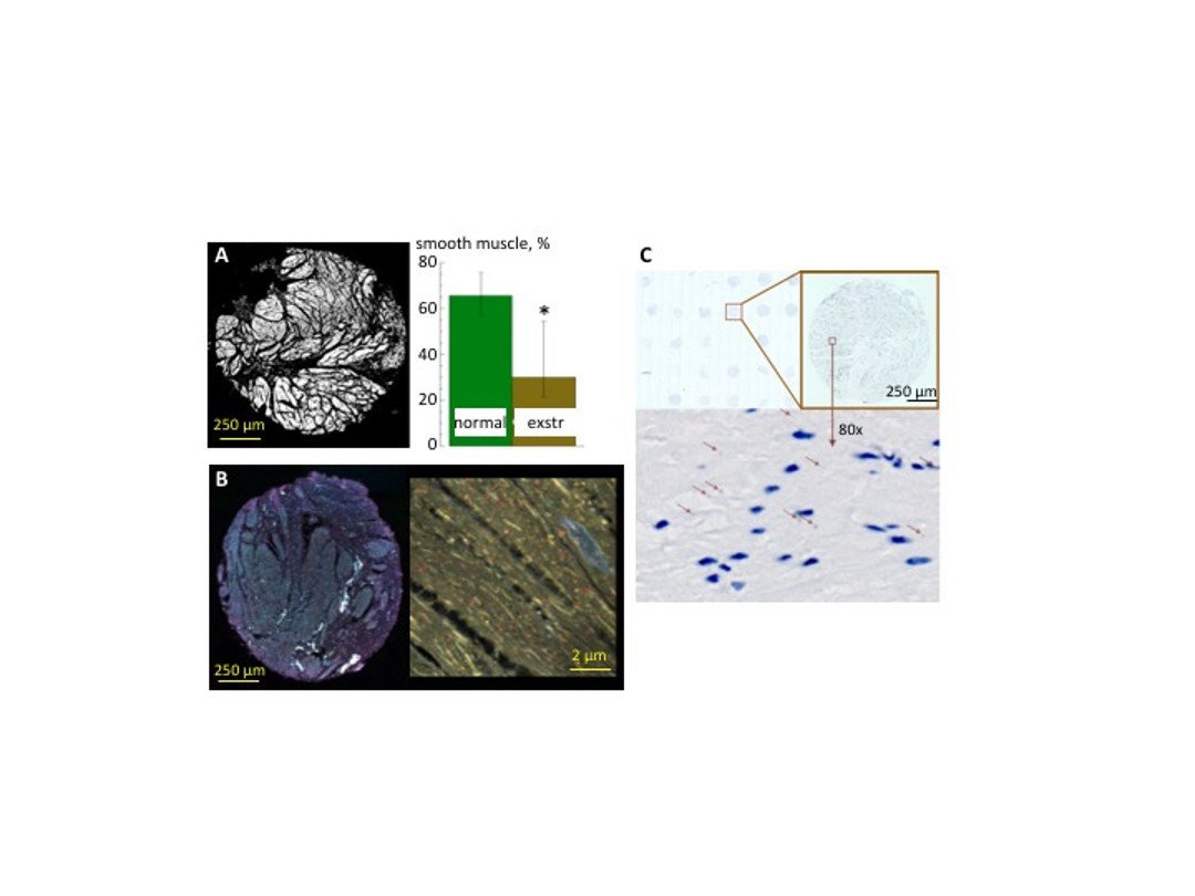 Anterior bladder wall samples were obtained from N=9 control patients with normally-functioning bladders (age; 26 [18,48] months; 2 female, 7 male; for ureteric re-implantation) or N=18 children with exstrophy (age; 62 [63,86] months; 6 female, 12 male; for bladder closure). Samples were immediately placed in 10% formaldehyde at 4°C, dehydrated and fixed in paraffin (FFPE samples). The study design was double-blind, all tissue blocks and antibodies used were blinded to the experimenter; the code was broken only when all analyses were completed. Previous functional data obtained with these tissue samples indicated a sample size of N=7 was adequate for p<0.05 at 80% power.