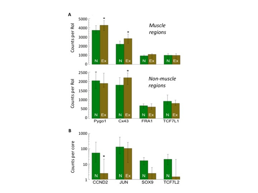 Tissue arrays were made from 0.8 mm diameter cores of FFPE samples and sectioned at 6-8 µm with an HM355S automatic microtome (Thermo Scientific). Sections were stained using a Leica Automated Bond System RXTM IHC/ISH for H&E/van Gieson staining (Figure 1A) and also probed with four different primary antibodies against Pygo1, Cx43, FRA1 and TCF7L1(Figure 1B) and single molecule RNAscope detection for CCND2, JUN, SOX-9 and TCF7L2(Figure 1C). These markers were chosen as they are known transcriptional downstream targets for Wnt-signalling pathways. Protein expression and gene transcription were detected by specific fluorophore labels for each antibody and chromogens for RNAscope labelling and were adjusted for variation in total amount of tissue in each core. Data are medians [25,75% interquartiles], differences between data sets were tested by two-way ANOVA with post-hoc non-parametric tests.
