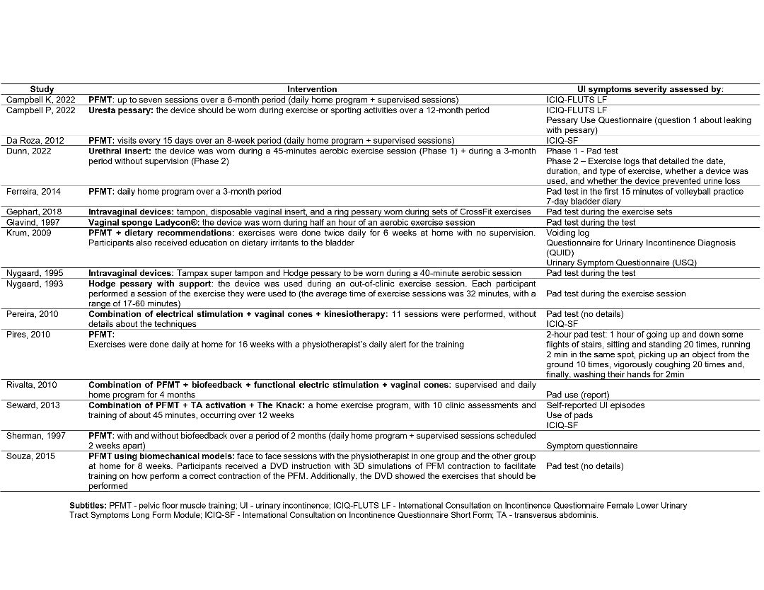 This systematic review was guided by the Cochrane Handbook for Systematic Reviews and followed the Preferred Reporting Items for Systematic Reviews and Meta-Analyses (PRISMA) guideline and protocols. It was registered in the International Prospective Register of Systematic Reviews (PROSPERO ID: CRD42022379138). With the assistance of a medical librarian, the search strategy was created for Medline based on PICO eligibility criteria developed by the team, then was adapted to the CINAHL, EMBASE, SciELO, LILACS and PEDro databases. The population consisted of females who reported symptoms of UI while participating in physical exercise, and the interventions involved any conservative treatment used to manage UI symptoms during exercise.  Any interventional study design in which a control group (e.g., no treatment or other intervention) was compared to an intervention group, as well as within-subject designs (i.e., baseline measures compared to post-intervention measures) were included. The outcome of interest was severity of UI signs and symptoms. An electronic literature search was performed in December 2022. The grey literature was searched through the Pro-Quest website. All retrieved articles were entered into the Covidence database and duplicates were removed. Two reviewers (MPR, MB) independently screened the titles and abstracts of retrieved articles for inclusion in the full text review. Studies were deemed eligible for inclusion if they met the pre-established PICO framework. Studies were excluded if the sample focused on pregnant females or those within the first postpartum year, if they were published in any language other than English, French, Spanish or Portuguese or if they presented secondary research data. Disagreements between the reviewers were solved through discussion. Full text review followed the title and abstract screening and was performed by the same two reviewers using the same approach. A custom data extraction sheet was developed by the team and pilot tested by the two reviewers using one included study before data extraction proceeded independently and in duplicate by the two reviewers. Extracted data included general publication information, study details, population characteristics,  intervention characteristics  and outcomes. The risk of bias of selected studies was assessed independently and in duplicate by the two reviewers (MPR, MB) using the Cochrane risk of bias tool (RoB2) for randomized trials or the Cochrane risk of bias in non-randomized studies of intervention (ROBINS-I). A narrative synthesis was used.