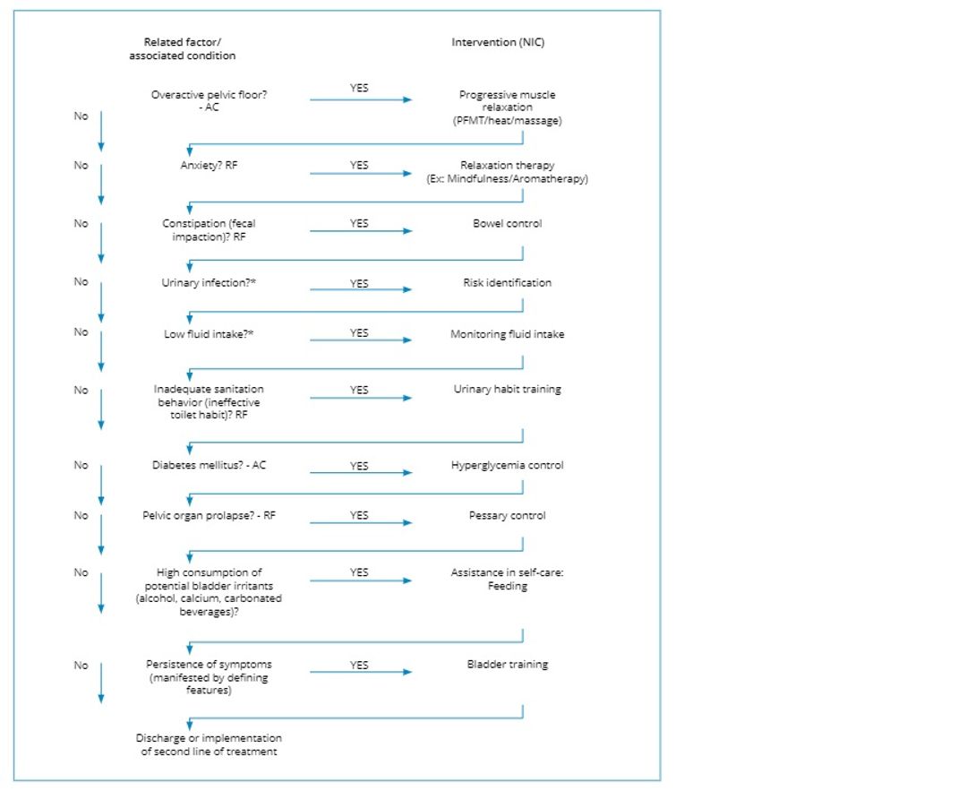The nursing diagnosis “Urge Urinary Incontinence” was identified in NANDA, which is found in domain 3 (elimination and exchange), class 1 (the process of secretion, reabsorption, and excretion of urine) under code 00019 and presents as the definition: Loss involuntary passing of urine in combination with or following a strong sense of urgency or urge to urinate. Related factors and associated conditions were listed, considering this is a multifactorial condition. After the evaluation through the collection of information and physical examination to identify the defining characteristics of the diagnosis, the professional must consult the protocol and identify related factors or associated conditions presented by each individual to list the interventions that need to be implemented. A flow was created with an order of related factors or conditions associated with Urinary Urinary Incontinence for investigation in order of relevance in the manifestation of symptoms and impact on subsequent items. For each identified factor or condition, the flow leads to actions related to behavioral changes that must be targeted. The application of the complete flow will result in a care plan, and the order in which they were distributed will help prioritize the most relevant actions. Flow chart description (factors, conditions, and actions): Hyperactive Pelvic Floor – Progressive Muscle Relaxation; Anxiety – Relaxation Therapy; Constipation – Bowel Control; Urinary Infection – Risk Identification; Low Water Intake – Monitoring of the Volume of Liquids; Inadequate Sanitary Behavior – Urinary Habit Training; Diabetes Mellitus – Control of Hyperglycemia; Pelvic Organ Prolapse – Pessary Control; High consumption of Potential Bladder Irritants – Assistance in self-care with food; Persistence of Symptoms – Bladder Training; Discharge or Implementation of second-line treatment.