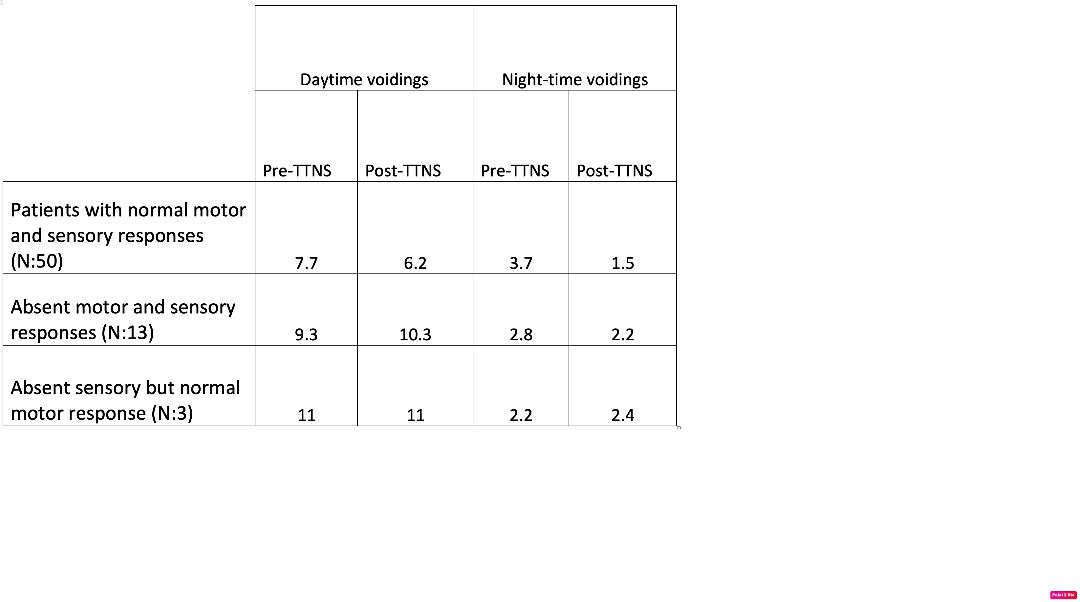 Thirteen patients with no motor and sensory responses showed no significant improvement with the TTNS. The poor TTNS outcome in this group could be due to insufficient stimulation of afferent fibres in the tibial nerve. Insufficient tibial nerve stimulation could be for several reasons, such as local oedema at the ankle, underlying peripheral neuropathy, or both.