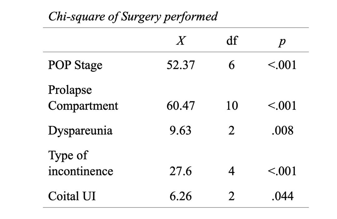 The comparisons of sexual function on the following categories: surgery peformed, months after surgery, POP stage, prolapse compartment, and type of incontinence reveal no significant differences among these groups as all p-values were greater than 0.05. ANOVA