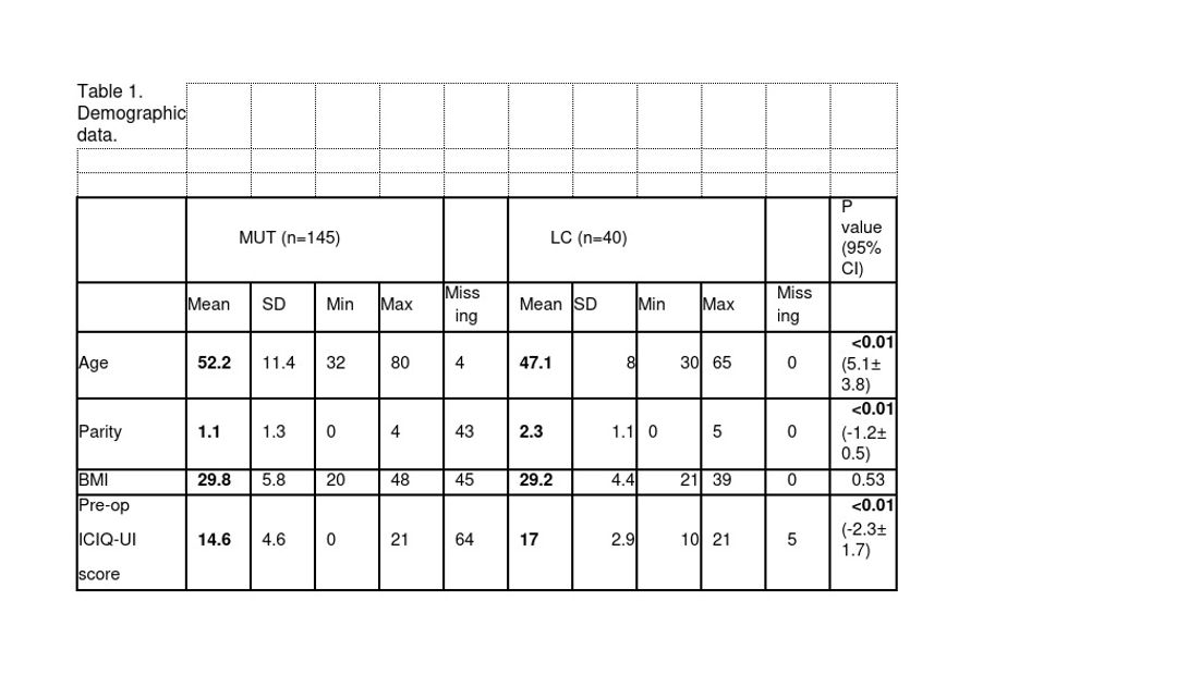 There was no difference between the groups in Body Mass Index (BMI) (P= 0.53), however women in the MUT cohort were significantly older (P<0.01; 95%CI 5.1± 3.8) and had lower parity (P<0.01; 95% CI -1.2± 0.5) than women in LC cohort. Pre-operative ICIQ-UI score was significantly lower in MUT group comparing to LC group (P<0.01; 95%CI -2.3± 1.7).