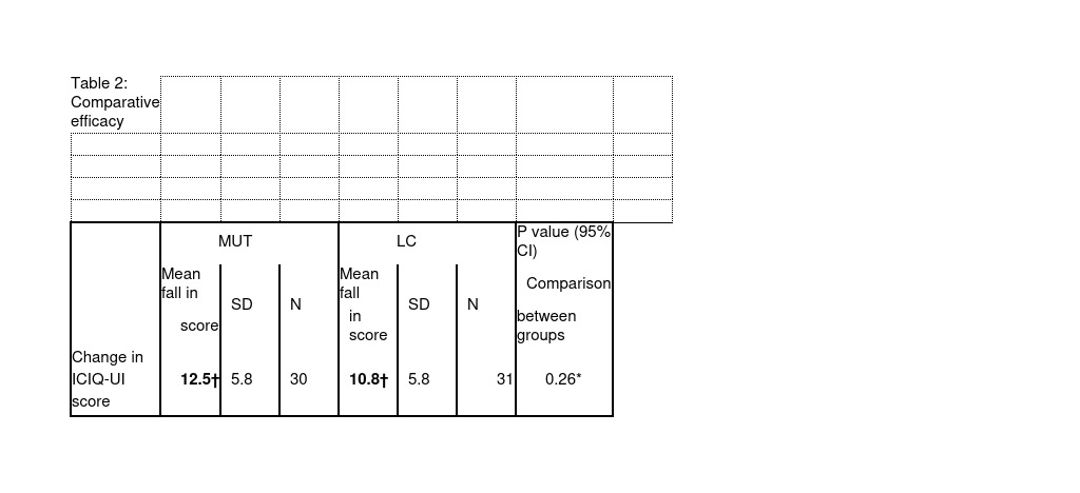 Table 2 showed both procedures were similarly effective in treating stress urinary incontinence in women. The ICIQ-UI score reduced significantly in both cohorts following the surgical treatment. The statistical analysis of the change between pre- and post-operative ICIQ-UI score in the two groups there were no significant group differences (p=0.26).