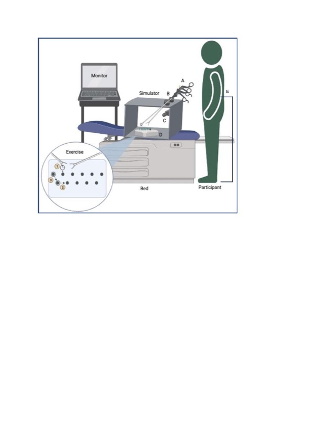 Figure 1 Figure 1: Simulation Set-Up A: 2 laparoscopic graspers: 1 Maryland grasper & 1 Johan Grasper B: 2 laparoscopic ports, representing the level of the patient’s umbilicus C: laparoscopic camera in fixed position, live video shows on monitor D: ring transfer