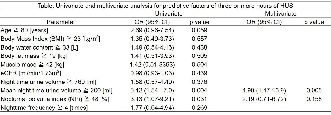 The mean age of the participants was 78.0 years. Significant improvement was evident in each of the variables investigated, as noted in their bladder diaries after one week, compared to before the administration of the medication. The mean night time frequency improved from 3.85 before administration to 1.62 after 52 weeks (p < 0.0001). HUS lengthened from 134 minutes before administration to 250 minutes after 52 weeks (p < 0.0001). Further significant improvement was seen in both the night time frequency and HUS from 12 weeks onwards, compared with one week after the initiation of administration (1 week vs 12 weeks, 24 weeks, 52 weeks: all p < 0.001). There were also significant improvements in the night time urine volume, nocturnal polyuria index, daily urinary frequency, volume of first night time void, IPSS, IPSS-QOL, OABSS, and G8 (all p < 0.05). Significant progress was manifest on the AIS (p < 0.0001), with a positive correlation between the amount of change in HUS and the amount of change on the AIS (p = 0.005, Pearson’s correlation coefficient: 0.325). Furthermore, the greater the change in HUS after administration, the better the PGI-I score (p < 0.0001, Pearson’s correlation coefficient: -0.489), suggesting that both quality of sleep and QOL improved with the administration of desmopressin. The continuation rate was high, with 93.1% at 4 weeks, 89.1% at 12 weeks, 81.2% at 24 weeks, and 71.7% at 52 weeks. Hyponatremia resulted in 5% of the patients discontinuing administration. A low serum Na level prior to administration was found to be an independent predictor in a multivariate analysis of predictive factors for hyponatremia (p < 0.05), and factors such as weight, BMI, and body water content were not significant factors. 16.7% of patients had a PGI-I score of 1, 35.9% patients had a score of 2, 32.0% patients had a score of 3, 15.3% patients had a score of 4, and there were no patients with a score of 5 or more. Patients with a good PGI-I had longer HUS after administration, and there was a significantly higher number of patients with a night time frequency of one void or less (p < 0.05). Examination of effect predictors, with an HUS of three or more hours defined as markedly effective, revealed that the mean night time urine volume was an independent effect predictor (p < 0.05). Muscle mass, body fat mass, and body water content were found not to be predictors.