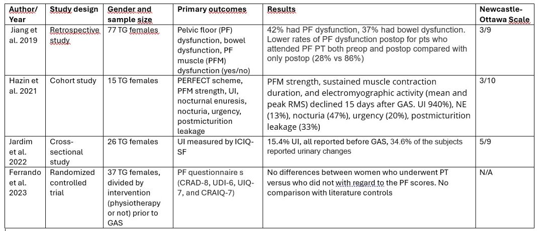 A scoping review was performed using a broad search strategy ((transgender OR transfeminine OR transmasculine OR transmen OR transwomen) AND ("pelvic floor" OR "urinary incontinence" OR "pelvic organ prolapse" OR "fecal incontinence")) comprising most pelvic floor disorders in March 2024 at PubMed database by two independent reviews. We excluded as primary outcomes studies that focused on pelvic pain and sexual function. No language barriers were present, and studies were selected by title and/or summary with the aid of Rayyan software. We did not plan to undergo metanalysis as this would be probably not possible to execute. Publication bias was not assessed due to the low number of publications. Data was presented in descriptive format. Our primary outcomes were urinary incontinence or pelvic organ prolapse or fecal/anal incontinence, diagnosed by subjective, dichotomous questions or by a validated questionnaire . Quality of the study was assessed by the Newcastle-Ottawa scale for non-randomized studies.