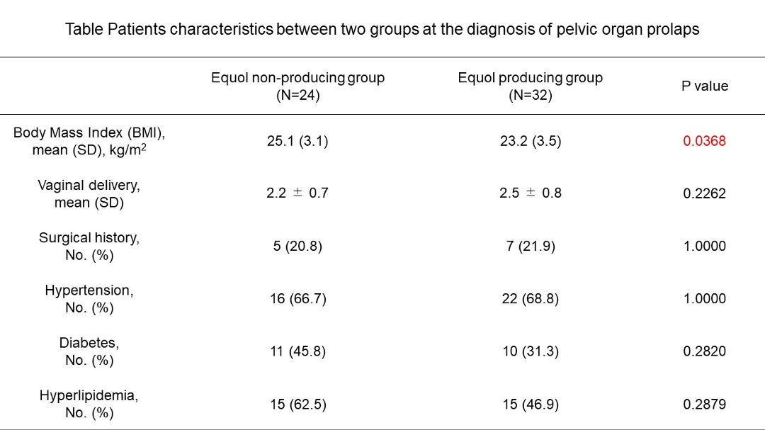 In this study, we found that the equol-producing group had a significantly higher age at onset of POP and a significantly lower BMI at the time of diagnosis than the non-producing group. These findings indicate that equol exposure may play an important role in suppressing the onset of POP. However, we speculate that the presence or absence of equol production had little effect on the differences between the subjective and objective findings at the time of diagnosis of POP. Equol has estrogen-like effects and is thought to maintain the health of female urinary and reproductive systems, protect vascular function, and reduce oxidative stress. These pharmacological effects suggest that equol may play a role in reducing the onset of POP, even indirectly, by reducing blood flow disturbances in the pelvic floor muscles and maintaining connective tissue.