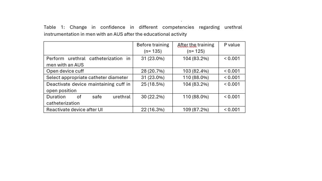 A total of 100 urologists and 35 urology residents participated, with a mean age of 38.6 ± 10.2 years, and 106 (76.3%) were men. The mean time for the EA, including pre- and post-test evaluations, was 15 minutes. Before the EA, 46 participants (34.1%) reported confidence in performing UI in a patient with an AUS if required to do so in an urgent situation, while 89 (65.9%) indicated they would require assistance from an experienced urologist or refer the patient. Post-training, 111 (88.8%; p<0.001) felt confident to independently perform the procedure in urgent situations. Significant improvements in confidence were observed across all evaluated competencies related to UI in men with an AUS, including the ability to open the cuff, deactivate device with cuff open, select appropriate catheter diameter, determine safe duration of urethral catheterization, and reactivate device after UI (Table1).