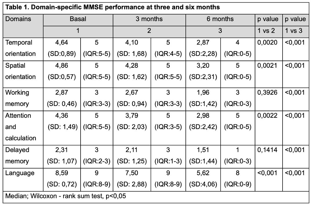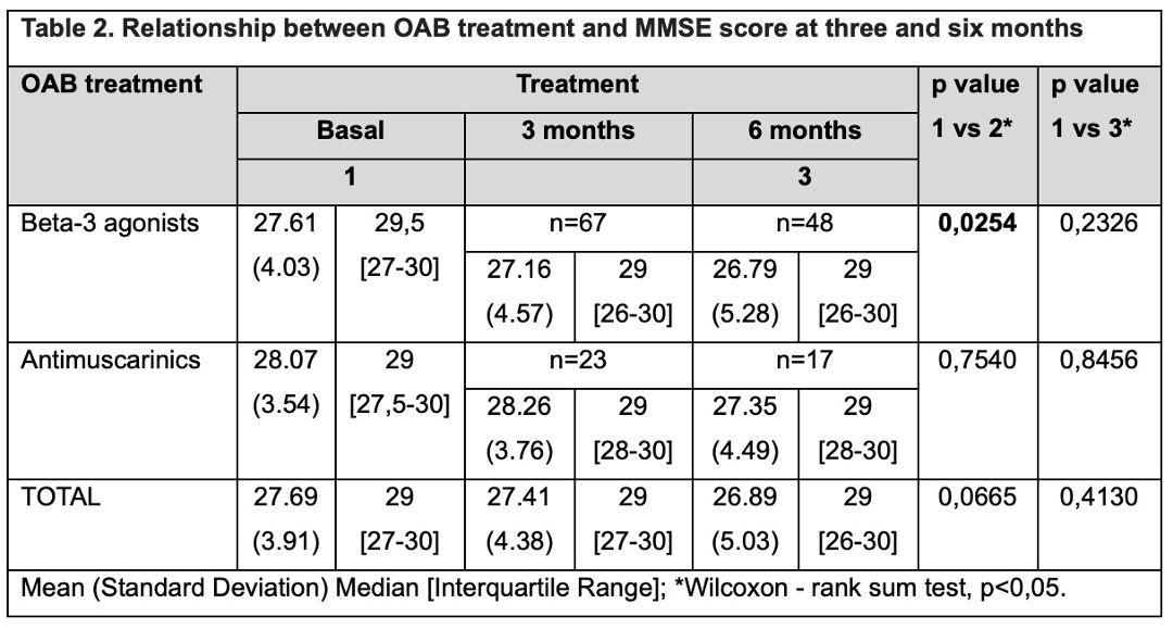 A total of 116 patients with OAB were included. 72% of patients completed three and six months of follow-up, while the remaining 28% completed only three months. 74% of patients were treated with beta-3 agonists, 24% with antimuscarinics, and 0,8% received combined therapy. The pre-treatment prevalence of mild cognitive impairment was 20,6%, and the cumulative overall incidence was 15% at six months. When evaluating the effect of treatment, it was observed that 21,9% of patients had a statistically significant decrease of two or more units in the MMSE score at 3 months and 7,6% at six months (p = 0,0278). The MMSE domains were evaluated independently, finding that at three months, time orientation, place orientation, attention, and language showed a significant change in the mean scores, while at six months, all domains presented a substantial decrease. No significant differences were found between the treatment groups when comparing the delta in MMSE scores between beta-3 agonists and antimuscarinics.