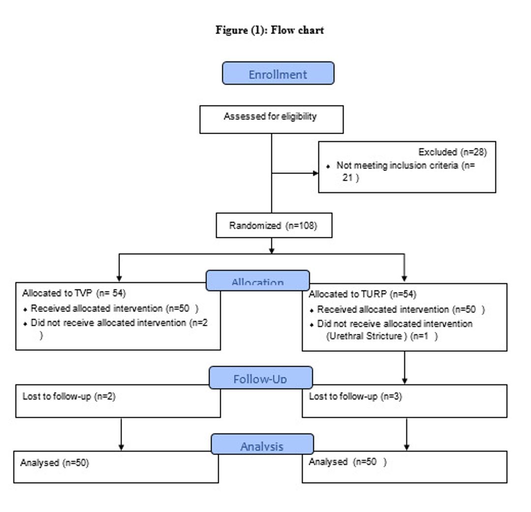 Men aged 50–70 years, diagnosed with BPH of prostate size ≥ 80 and meeting inclusion criteria were randomly assigned to undergo either TVP or TURP. Preoperative evaluations, surgical procedures, and postoperative follow-up assessments were conducted according to standardized protocols. Primary endpoints included International Prostate Symptom Score (IPSS), maximum urinary flow rate (Qmax), and post-void residual volume (PVR). Secondary endpoints encompassed complications and adverse events This was a randomized clinical trial conducted on 100 cases at the Urology Department of Qena University Hospital