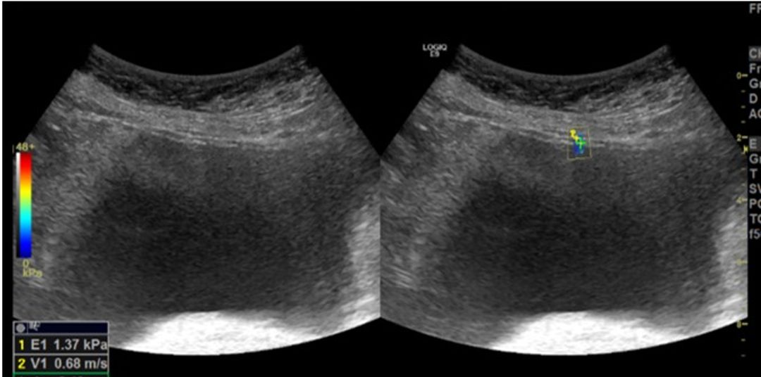 Figure 3 Shear Wave Elastography (SWE) measurements of the anterior wall (White arrow) in a 58-year-old female patient
