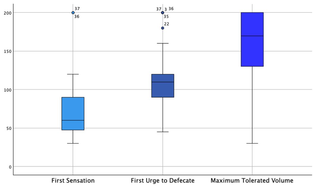 Zhang et al (2023), conducted a similar study in which no significant differences were found in the volume of the first constant sensation, the volume of defecatory urge and the maximum tolerable volume among the different subtypes of functional defecation disorder. 2