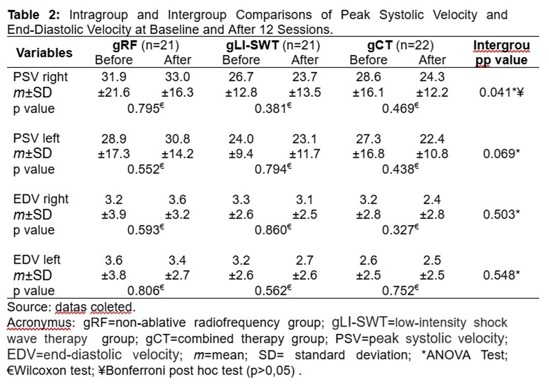 Conservative treatment for Erectile Dysfunction (ED) may have adverse effects or be ineffective, demanding the investigation of new therapeutic approaches[1]. Thus, this study aimed to evaluate the hemodynamic response in men with ED undergoing radiofrequency therapy, low-intensity shock wave therapy, and combined therapy.