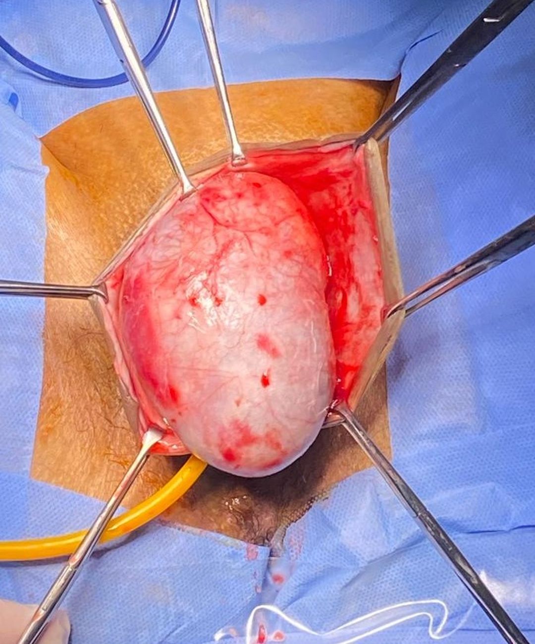 A 40-year-old multiparous woman presented with a progressively enlarging clitoral-labial mass that she first noticed 10 years ago. The mass caused significant discomfort while wearing underwear, during menstruation, and pain during intercourse. The patient had a history of circumcision at 2 years of age, with no other significant medical history. Pelvic examination revealed a well-circumscribed, mobile, non-tender, cystic mass measuring 7x10 cm in the clitoral region, obstructing the urinary meatus and vaginal introitus. MRI imaging showed a 9.5 x 5 x 8.5 cm anterior vulvar cystic lesion, likely an epidermal inclusion cyst, with no solid components or communication with the urethra or vagina. The patient underwent clitoral and vulvar cystectomy with reconstruction of the labia and excision of redundant skin. The cystic mass was sent intact for histopathological examination.
