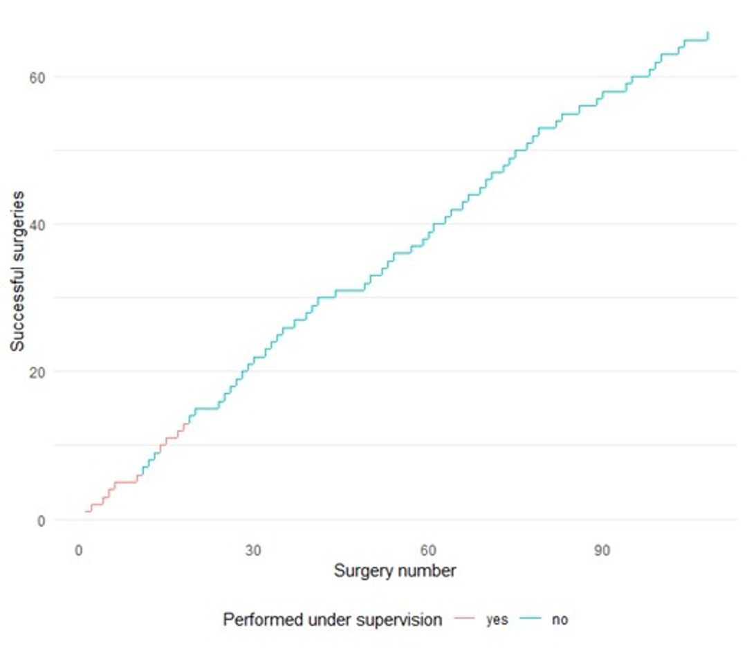 Post-prostatectomy incontinence is a complication which significantly impacts patents’ quality of life [1]. After failed conservative treatments, surgery is recommended [2]. While artificial urinary sphincter is the standard surgical treatment for post-prostatectomy incontinence, adjustable continence therapy balloons (ProACT) have emerged as a less invasive alternative over the past two decades (figure 1). Efficacy and complication rates of ProACT are comparable to AUS [3]. ProACT implantation is considered technically challenging and limited to three high-volume Dutch medical centers, yet little is known about the surgical learning curve. This study aims to assess the learning curve of a single surgeon to inform training requirements for ProACT implantation.