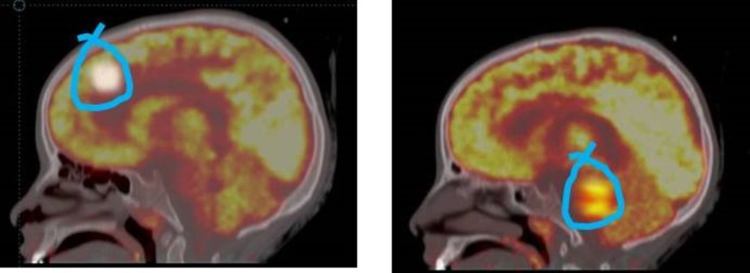 The study included 40 patients with median age of 5.6Yrs (range 4-16). of these 40, 24 (60%) had DO and 16 (40%) UD. In cases of detrusor overactivity TcPTNS decreased the activity in the mid-cingulate gyrus, hypothalamus, premotor cortex and lateral pons (fig, 1a & b). These areas in brain are reported to be involved in the process of micturition. On the contrary avid uptake was noted in lateral cingulate gyrus, mid pons and periaqueductal grey [PEG] in cases of underactive detrusor (UD) (fig. 2a). Hyper metabolism in these areas has been recorded during strong urge for micturition.