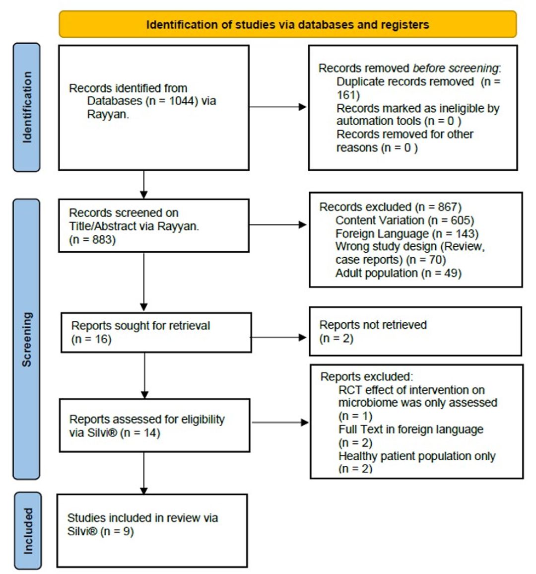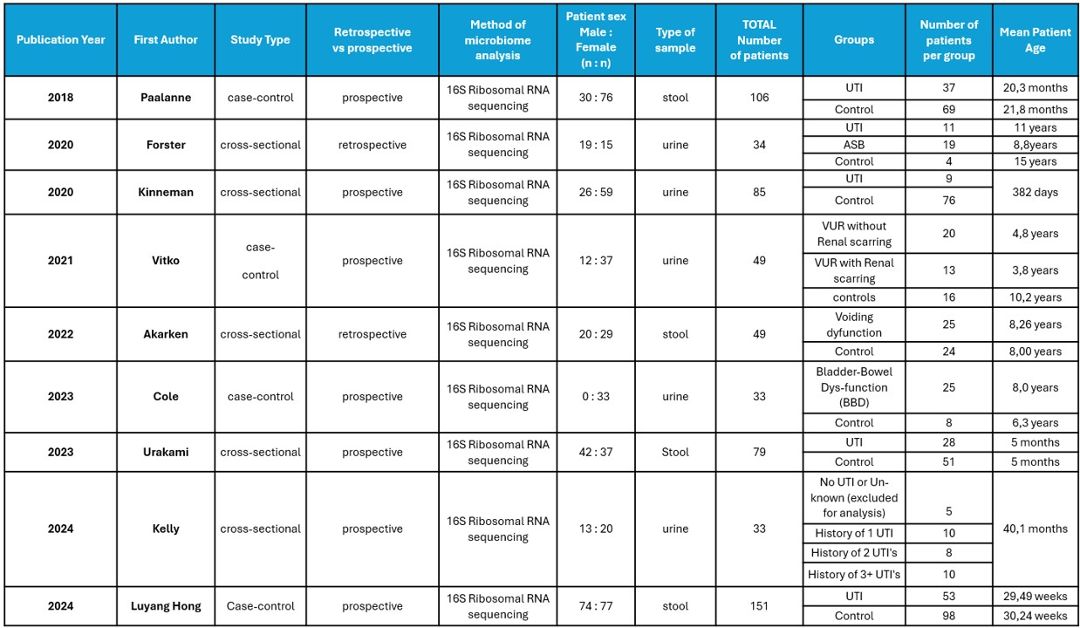 A systematic review was conducted following PRISMA guidelines. (Figure 1) PubMed, Embase, and CINAHL databases were searched for studies analysing gut and urinary microbiomes in paediatric LUTS and UTI patients. Using software’s Rayyan and Silvi® (Silvi.AI), two reviewers independently screened and reviewed the articles. Data was extracted for LUTS or UTI patients and healthy controls on: method of microbiome analysis, sex distribution, mean age of patients, predominant bacteria phylum, class, order, family, genus and species, alpha diversity and beta-diversities. Quality assessment was performed using QUADOMICS checklist. (3) A total of 9 studies met the inclusion criteria. Study characteristics and patient group distribution are visible in Figure 2.