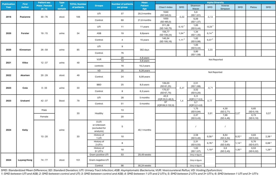 A total of 619 subjects were identified from the 9 eligible studies (2018-2024), with 274 patients (44,3%) patients part of pathology groups and 345 patients (55,7%) controls. Mean patient age varied significantly across studies ranging from 5 months to 15 years. Both male (38,1%) and female (61,9%) patients were represented. Clinical conditions included were urinary tract infections (UTI), voiding dysfunction (VD), vesicoureteral reflux (VUR) and bladder-bowel dysfunction (BBD). Sample types analysed included stool in 4 studies and urine in 5 studies. Reduced urine alpha diversity and distinct bacterial compositions were found in UTI and BBD patients (Figure 3), while beta diversity analyses revealed distinct clustering of microbiome compositions between affected and healthy groups. The gut microbiome of UTI patients showed alterations in Actinobacteria and Proteobacteria abundance, while voiding dysfunction (VD) was linked to presence of Fusobacterium nucleatum, Clostridium difficile and Bacteroides clarus without significant VDSS correlation. Sex-based differences were observed, with female microbiota shifting at puberty while male profiles remained stable. Though not a primary outcome, antibiotic use 1–14 days prior to sampling lead to a substantial reduction in species richness and reduced overall microbiome diversity. These differences were near-completely recovered with time.