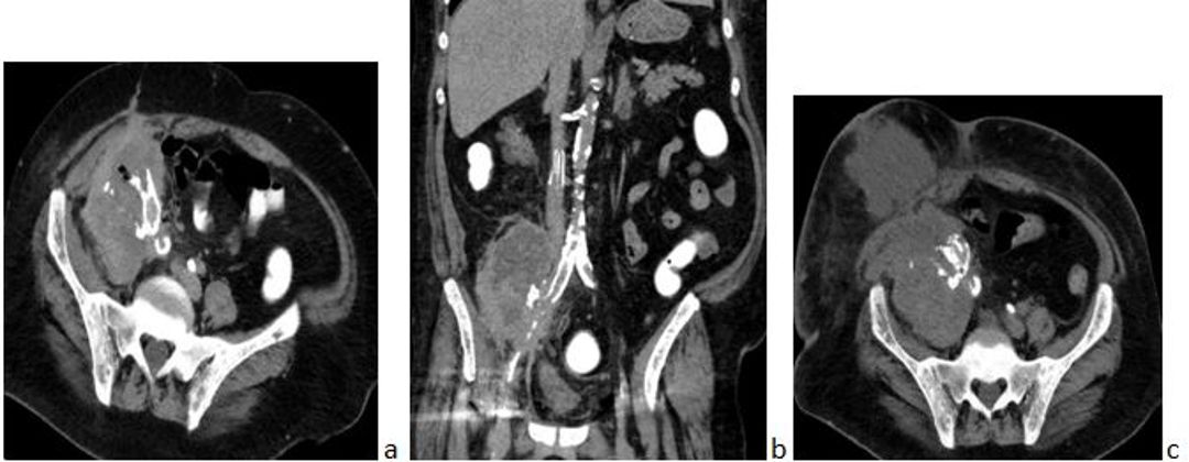 Surgical removal was challenging due to firm adhesions to the abdominal wall, psoas muscle, peritoneum, and iliac vessels. The majority of the graft was excised via a retroperitoneal approach, and histopathological analysis was conducted. Two weeks postoperatively, the patient developed a minor hematoma at the surgical site, managed with open drainage and antibiotics. Pathology confirmed xantho-granulomatous inflammation with sarcomatoid RCC features. Given the patient’s age and comorbidities, palliative care with adjuvant radiotherapy was advised.