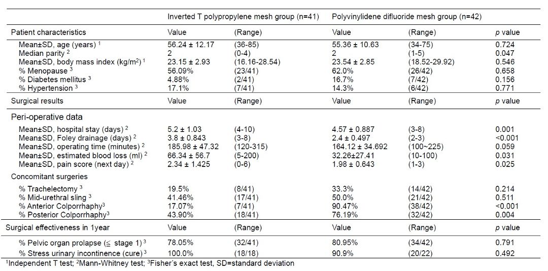 The patient characteristics were similar between the two groups, including mean age, body mass index, and menopause status (Table 1). The rates of concomitant surgeries, such as trachelectomy and mid-urethral sling procedures, were comparable between the groups. However, a higher proportion of patients in the PVDF mesh group underwent anterior colporrhaphy (90.47% vs. 17.07%, p = 0.001) and posterior colporrhaphy (76.19% vs. 43.90%, p = 0.004).