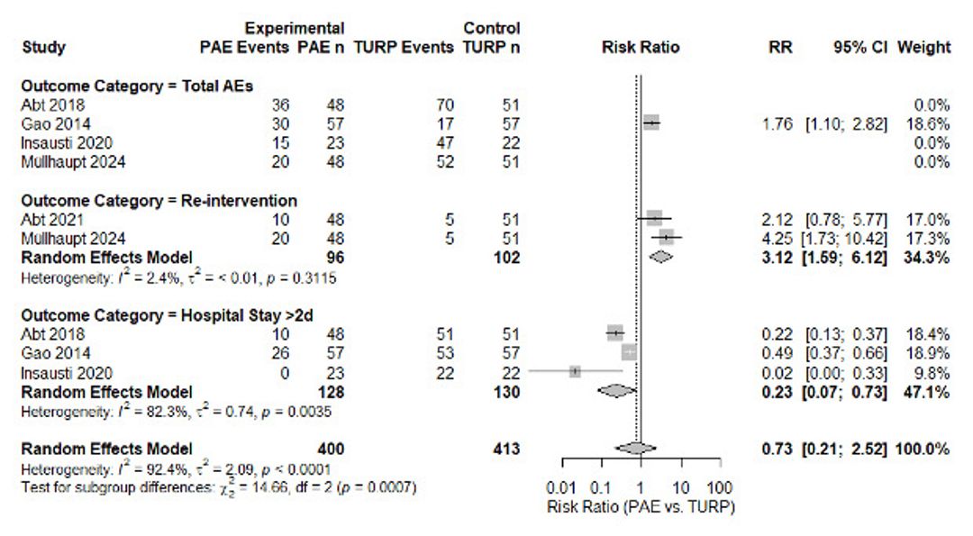 Seven studies encompassing 614 participants (341 undergoing PAE, 273 undergoing TURP) were included. PAE demonstrated a statistically significant advantage in preserving sexual function (mean difference [MD] = 1.81; 95% CI: 1.25–2.37; p < 0.001) and yielded a shorter hospital stay (risk ratio for hospital stay >2 days = 0.23; 95% CI: 0.07–0.73; p = 0.013). In contrast, TURP achieved a greater reduction in urinary symptoms (MD = 2.48; 95% CI: 1.07–3.89; p < 0.001) and lower re-intervention rates (risk ratio = 3.12; 95% CI: 1.59–6.12; p < 0.001). No significant difference was observed in quality of life outcomes between the two procedures (MD = 0.29; 95% CI: –0.16–0.73; p = 0.208). Heterogeneity ranged from moderate to high across outcomes.