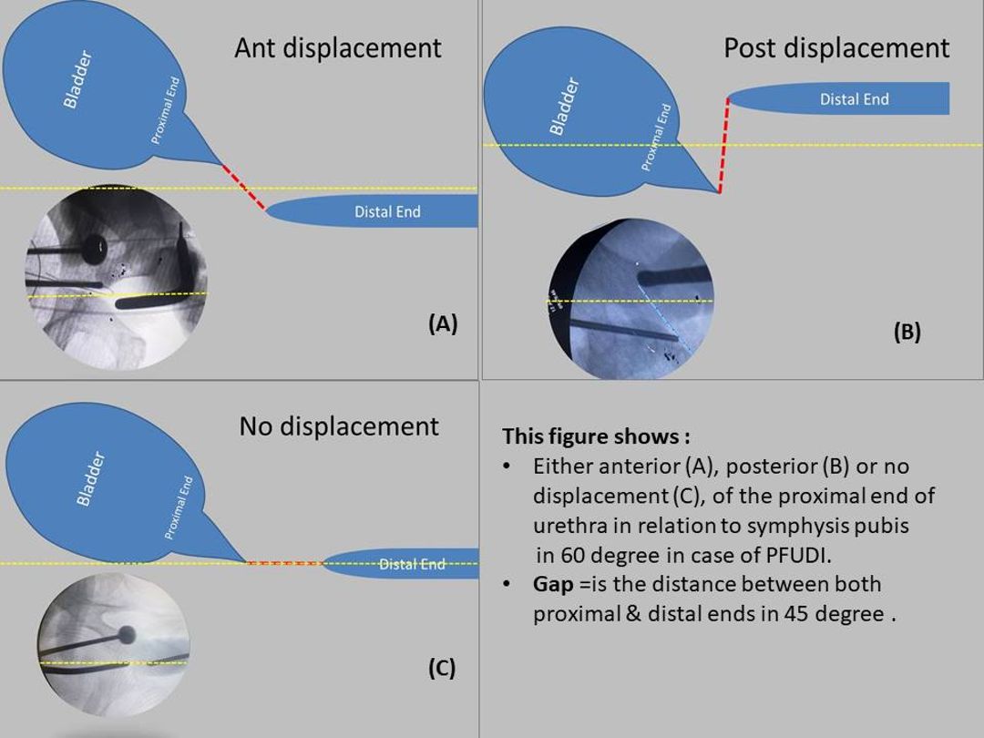 Twenty patients (≥18 years) with PFUI underwent elaborated perineal urethroplasty. Gapometry and displacement direction were measured intraoperatively by combined urethroscopy and suprapubic cystoscopy under real time fluoroscopy at 45° and 60° with combined cysto-urethrogram. Follow up occurred at 1, 3 and 6 months postoperatively for assessment of outcomes (international prostate symptom score (IPSS), urethral stricture surgery patient-reported outcome measures (USS PROM),maximum urine flow rate (Q-max), post voiding residual urine (PVR) & perioperative complications). Success was defined as a normal voiding without straining, with Q-max ≥ 15 ml/s, no need for dilatation, no evidence of stricture and no re-intervention.
