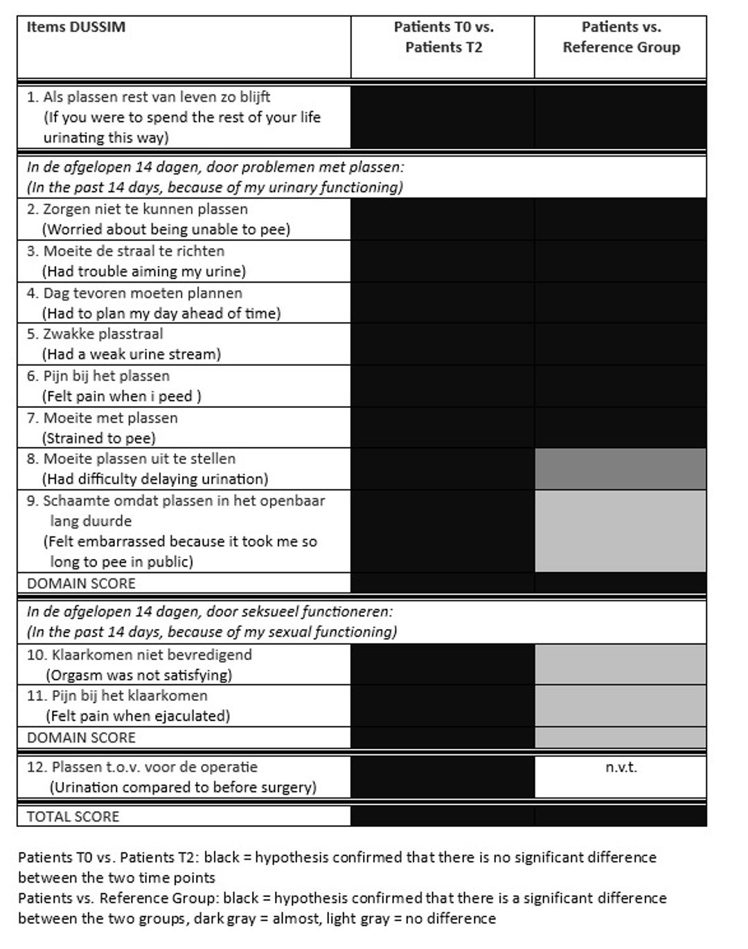 The official steps taken towards the Dutch translation did not lead to any significant linguistic or substantive alterations. The participants understood the DUSSIM well, with comments on question 10 (negatively formulated) and question 12 (somewhat difficult). In the US-group, 6 out of 14 felt a question on self-catheterization was missing. For all questions, subdomains, and the total score, responses at T0 and T2 in the US group showed no significant difference (hypothesis-rejecting threshold: p=0.05), confirming the already in the original rigorously tested consistency and reproducibility. As hypothesized, the DUSSIM successfully differentiated between the US group and the reference group (threshold the same), with the exception of the questions on sexuality and urination in public. See Table.