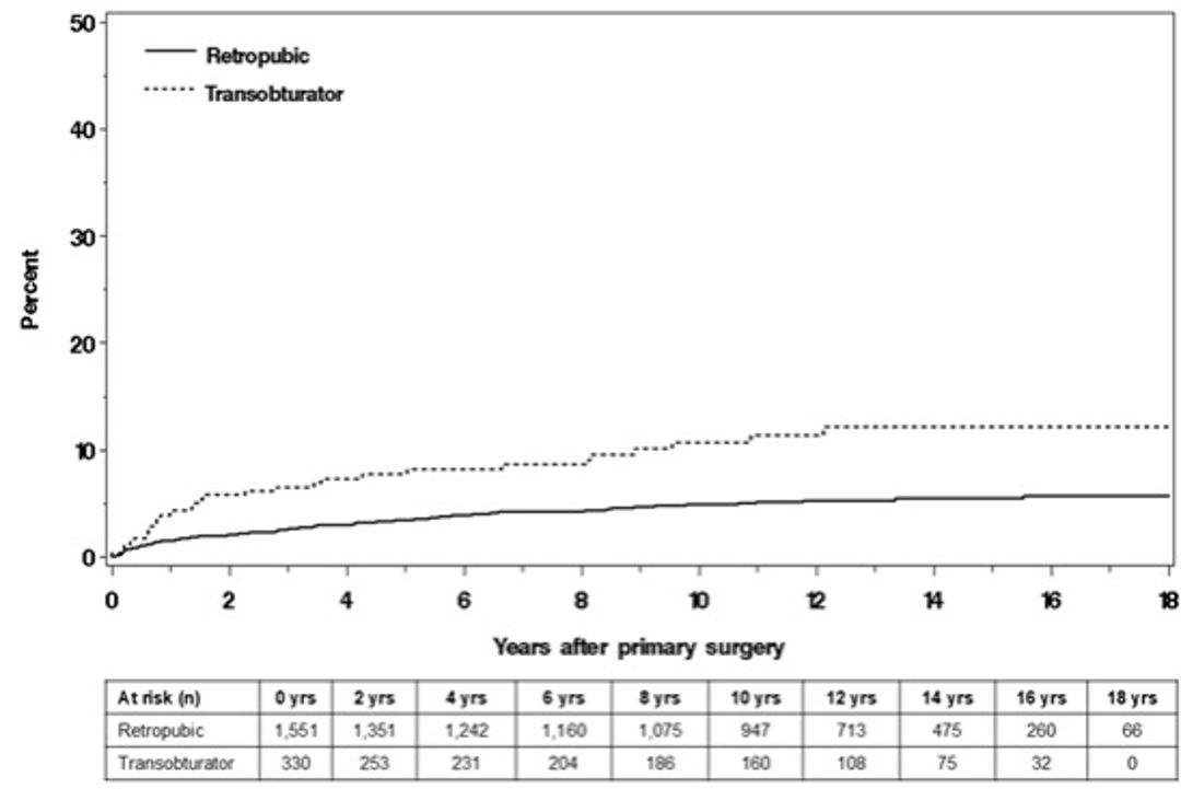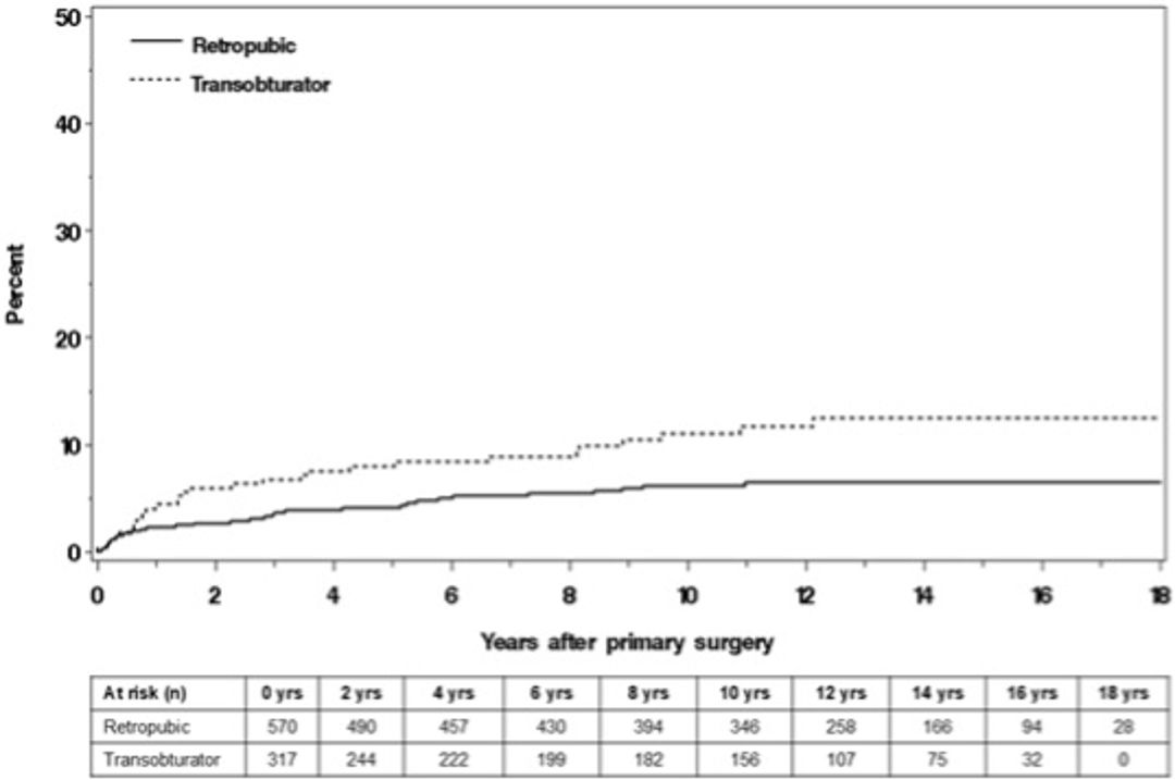 Median time to reoperation was 2.8 years (interquartile range 0.7–5.8) and 1.5 years (interquartile range 0.7–5.0) for the retropubic and transobturator groups, respectively. Median follow-up for the remaining patients without reoperation was 11.8 years (interquartile range 6.7–14.7 years) for retropubic sling and 10.1 years (interquartile range 3.4–14.0 years) for the transobturator slings.