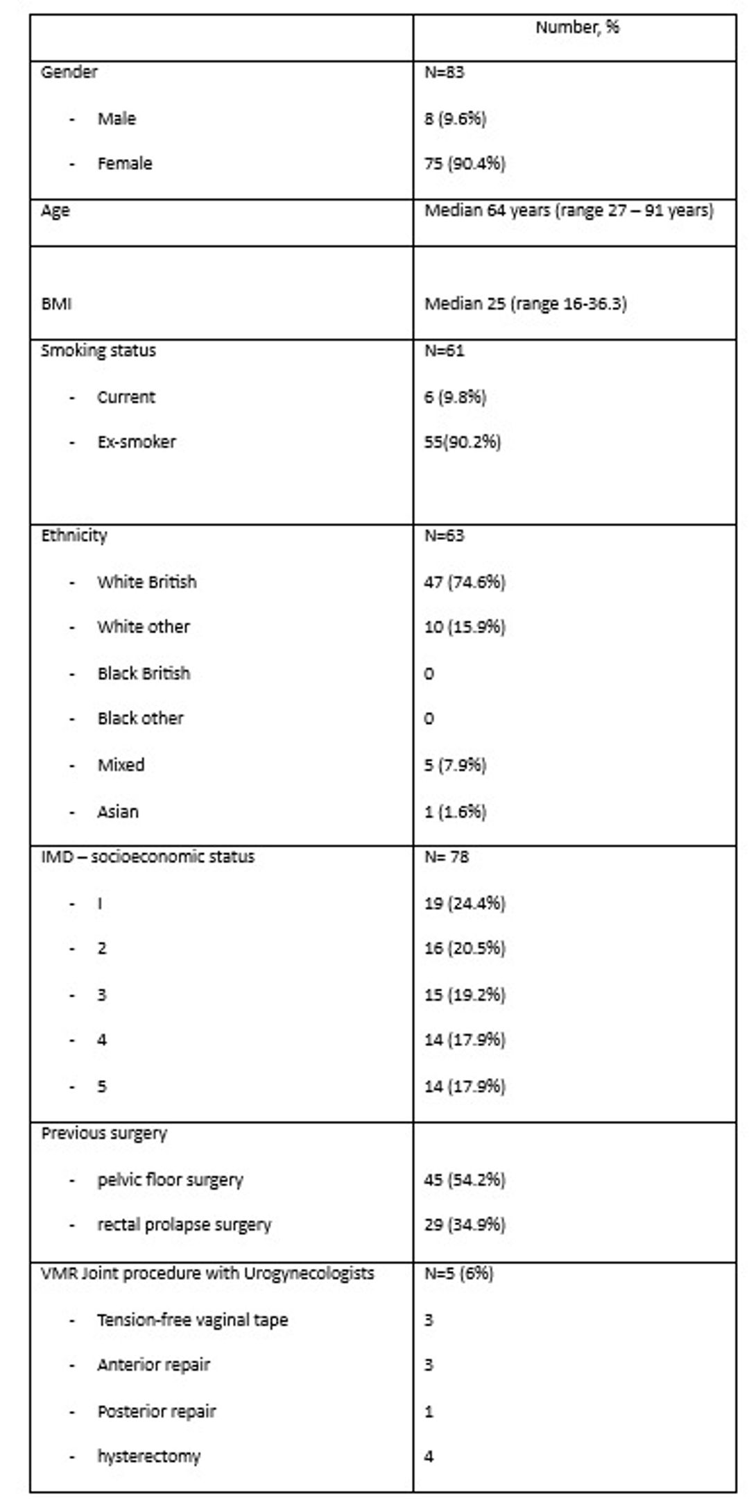 VMR was performed in 83 patients with female dominance (90.4%). The median age of the patients was 64 years and the mean BMI was 25. Diagnosis of rectal prolapse was made clinically in 32.5% patients and a defaecating proctogram was performed in 59%. Previous rectal prolapse surgery had been performed on 29 (35%) patients. Joint Urogynaecological and Colorectal procedures were performed in 5 patients. Further details are mentioned in Table 1.
