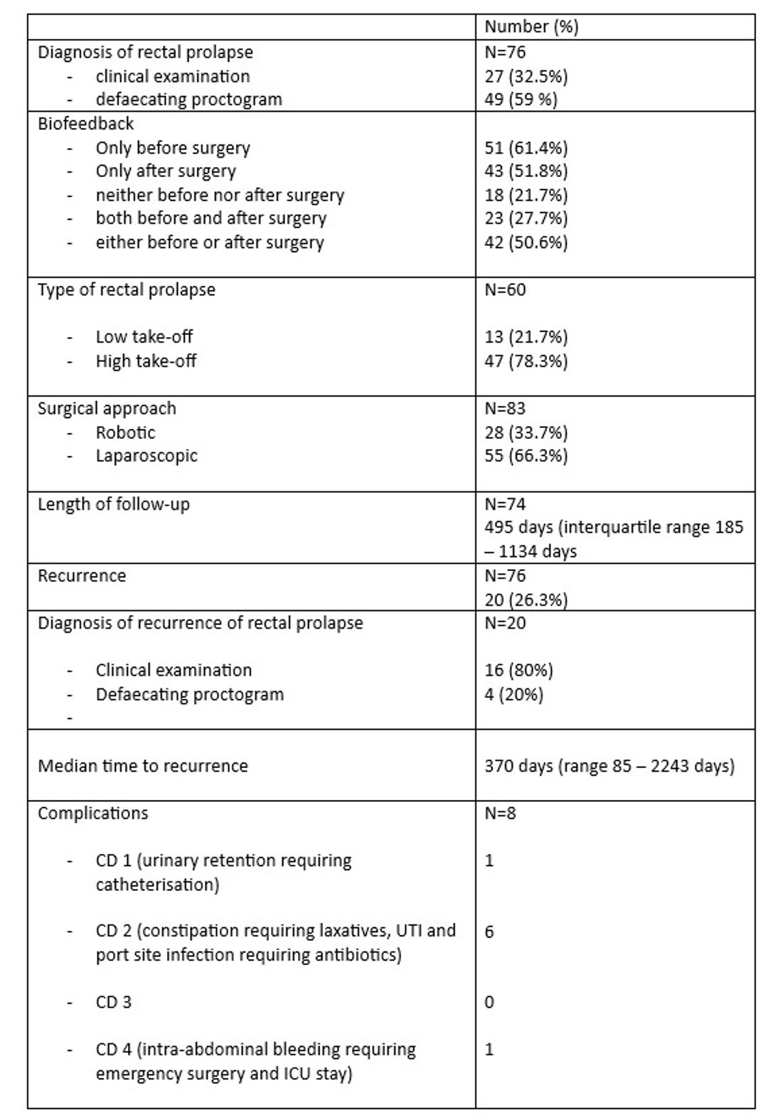 Recurrence of rectal prolapse occurred in 20 (26.3%) patients at a median duration of 370 days. The diagnosis of recurrence was made clinically in 80% patients while a defaecating proctogram was performed in 4 (20%). Table 2 provides peri-operative details.