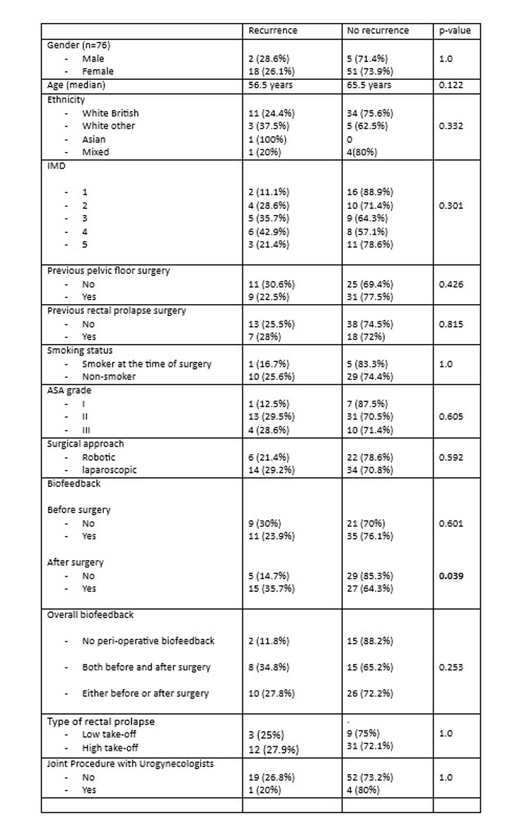 Recurrence of rectal prolapse was more likely to be seen in patients who underwent bowel function retraining after surgery when compared to those who did not have any bowel function retraining preoperatively (35.7% versus 14.7%, p-value 0.039). However, there was no difference in recurrence of the prolapse when patients who underwent biofeedback both before and after surgery were compared to those who did not undergo any biofeedback peri-operatively.
