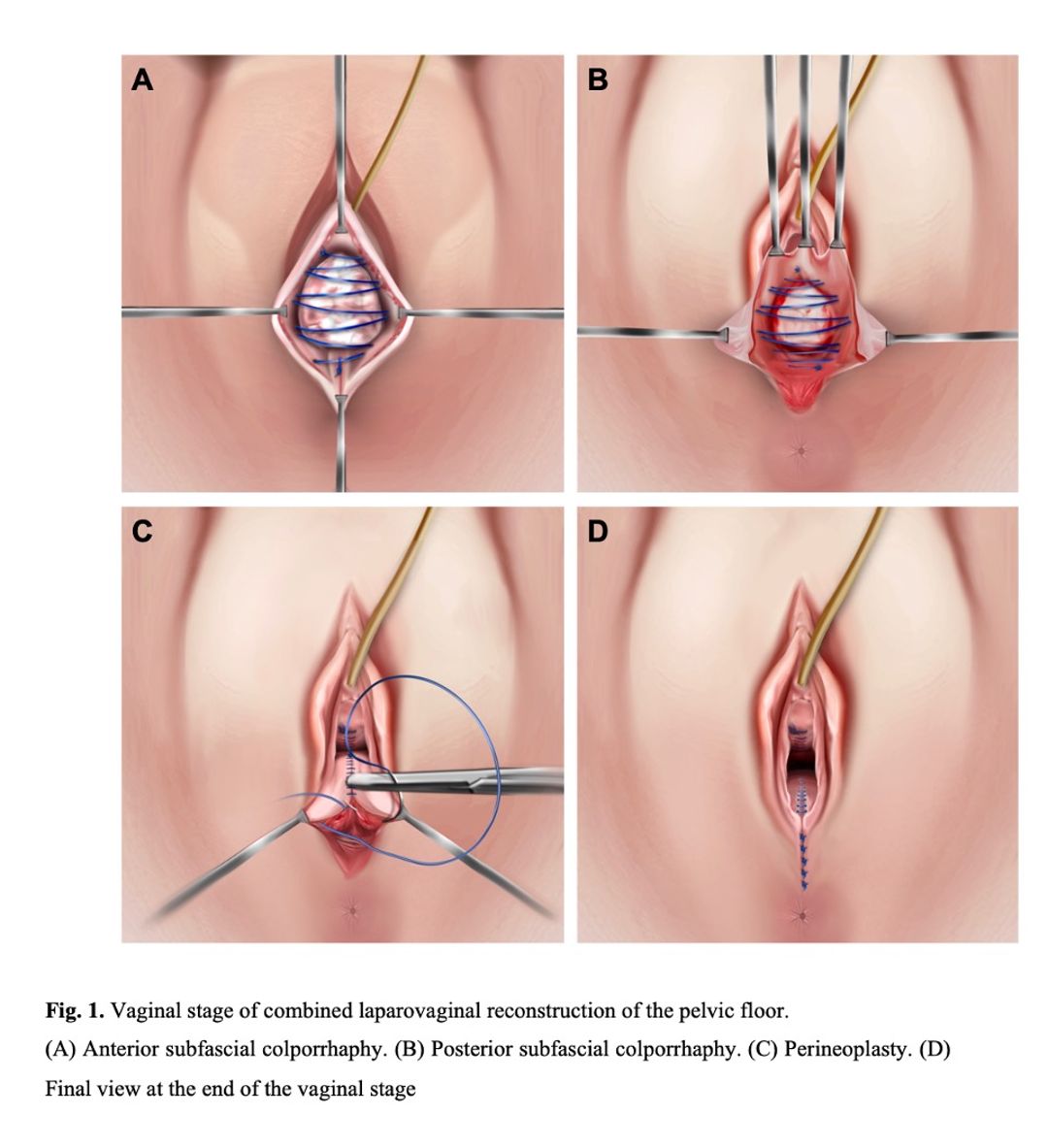 The combined laparovaginal approach demonstrated high efficacy and favorable safety outcomes. The low recurrence rate (5%) indicates effective anatomical correction, particularly considering the simplified fixation technique without extensive vaginal dissection. The absence of implant-related complications such as erosion and dyspareunia highlights the advantages of preserving uterine anatomy and minimizing extensive dissection. The study’s findings suggest the laparovaginal technique effectively addresses both anatomical and functional aspects of pelvic floor defects, significantly enhancing patient-reported outcomes. Moreover, the simplified sacrohysteropexy potentially reduces the risk of severe intraoperative complications (e.g., bowel and bladder injury), observed in 0.4–10% of traditional procedures [1]. Importantly, no intraoperative injuries occurred in our cohort, further supporting the safety of this modified approach.