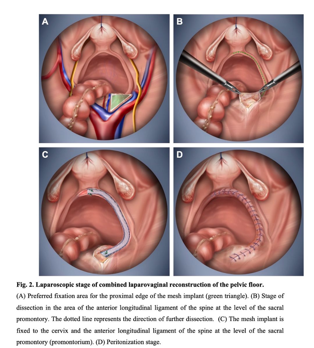 A single-center retrospective cohort study was conducted involving 74 patients who underwent laparovaginal hybrid pelvic floor reconstruction between July 2021 and July 2023. Inclusion criteria were anterior-apical prolapse (POP-Q stages Ba, C ≥ 0), without prior hysterectomy, malignancies, or active infections. Surgery involved vaginal anterior and posterior colporrhaphy with perineoplasty, followed by laparoscopic sacrohysteropexy, with the implant fixed to the cervix and sacrum (Figures 1 and 2). Outcomes were assessed through POP-Q staging, validated questionnaires (PFDI-20, PISQ-12, ICIQ-SF), and complication rates at 12–18 months postoperatively.