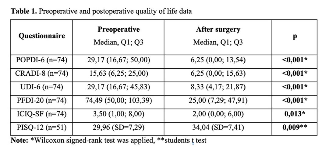 The mean operative time was 162.2±45.2 minutes, with no significant intraoperative or immediate postoperative complications. Anterior colporrhaphy was performed in 68%, posterior colporrhaphy in 78%, and perineoplasty in 68% of patients. At follow-up, POP recurrence requiring reoperation was identified in 4 patients (5%). De novo urinary incontinence occurred in 3 patients (4%), and worsening of pre-existing stress urinary incontinence (SUI) was observed in 2 patients (2.7%), requiring subsequent sling implantation . There were no implant erosions or cases of de novo dyspareunia. Patients reported significant improvement in quality of life across all questionnaire subscales (Figure 3).